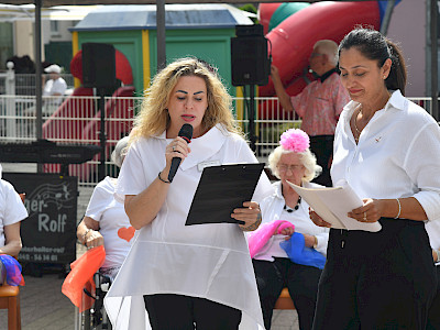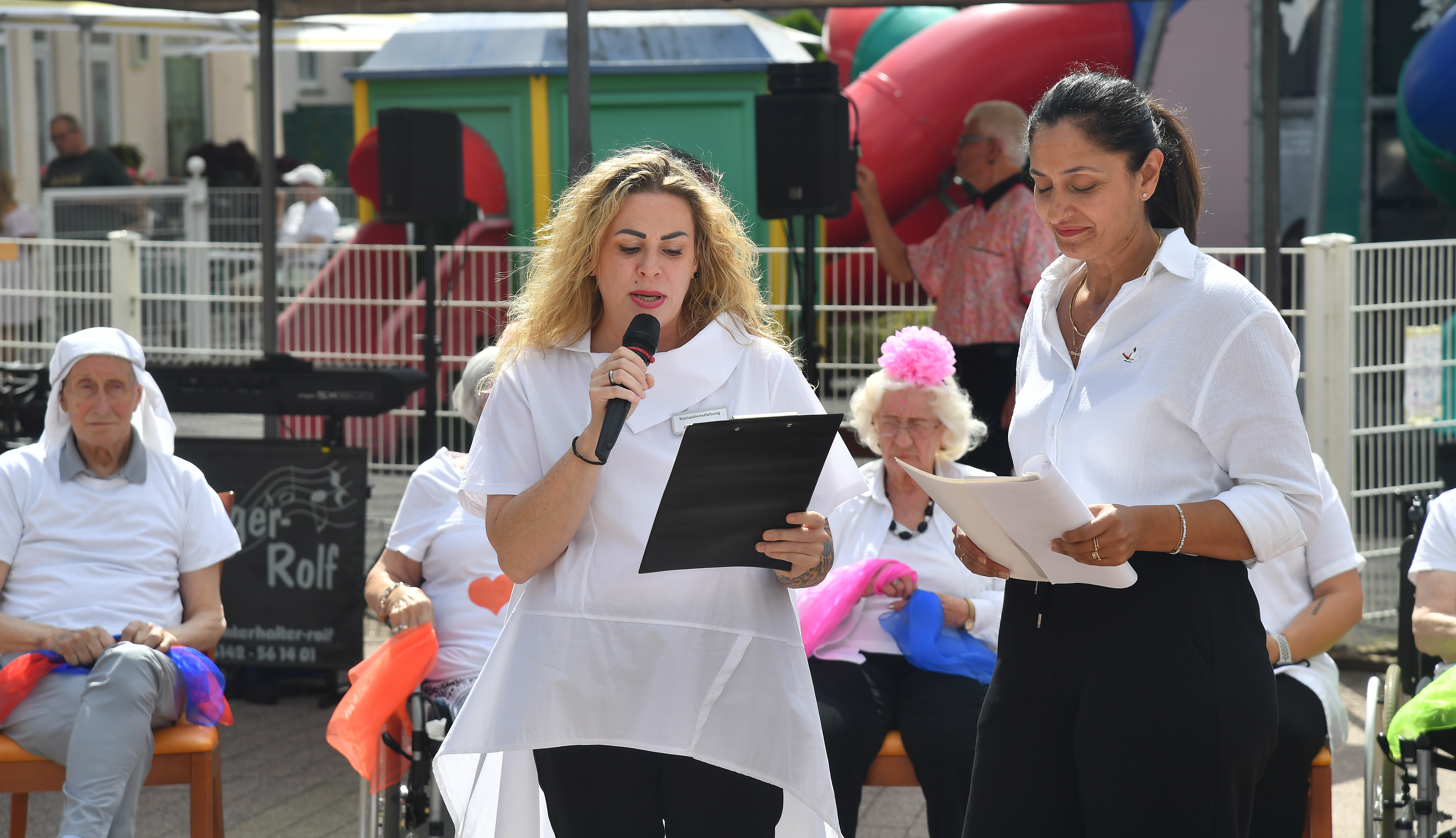 Den Auftakt des Programms gestalteten die Heimbewohnerinnen und -bewohner mit einem Sitztanz. Mit bunten, selbstgebastelten Kopfbedeckungen und sommerlichen Blumen präsentierten sie das diesjährige Motto „Mit Musik und Tanz bleibt die Seele ganz". Die Begeisterung bei den Teilnehmenden war spürbar und wurde mit kräftigem Applaus belohnt.
