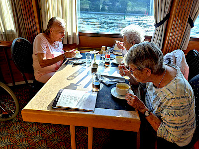 Das Abendessen nahmen die Teilnehmer und Betreuerinnen auf dem Schiff ein, bevor sie in Boppard wieder abgeholt wurden und mit dem Bus zurück ins Seniorenhaus fuhren.