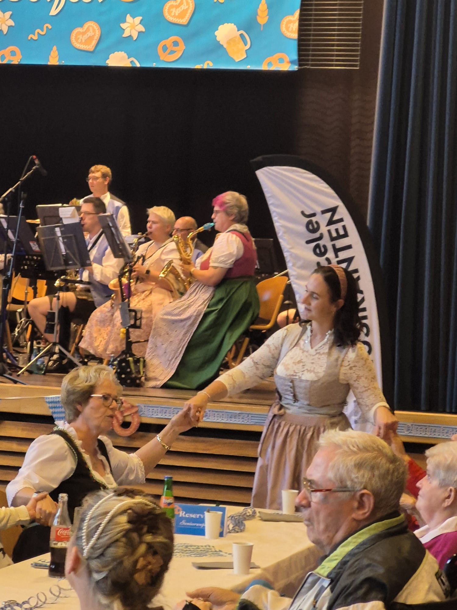 Nur zwei Tage später, am 5. Oktober, fand dann unser großes Oktoberfest im Haus statt. Schon am Vormittag war die Vorfreude spürbar: Der Speisesaal war liebevoll in Weiß-Blau geschmückt, und überall duftete es nach frischen Brezeln und Weißwürsten.