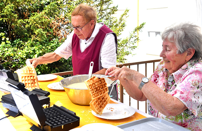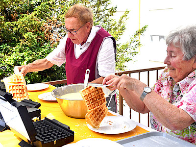 Monika Zentgraf moderierte den Nachmittag charmant. Wie immer fand sie die rechten Worte, wenn es darum ging, die Spannung ein wenig zu erhöhen, wer denn als nächstes auftreten sollte, während die Heimbewohner liebevoll verköstigt wurden. -Unter anderem mit frischen Waffeln, die von Heimbetreiber und -leiter Michael Adrian persönlich gebacken wurden.